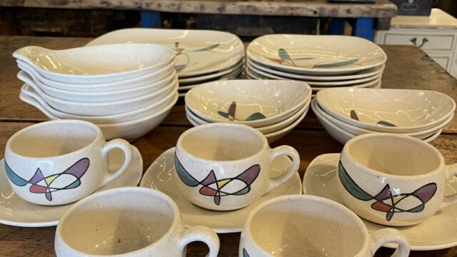 Metlox1920年代から歴史を持つカリフォルニアのメーカーになります。こちらは50年代に作られた"Poppytrail"シリーズのフリーフォーム柄です。大量に入荷しました。アトミックエイジがまさに!な感じですが大人っぽく上品な佇まいでお...